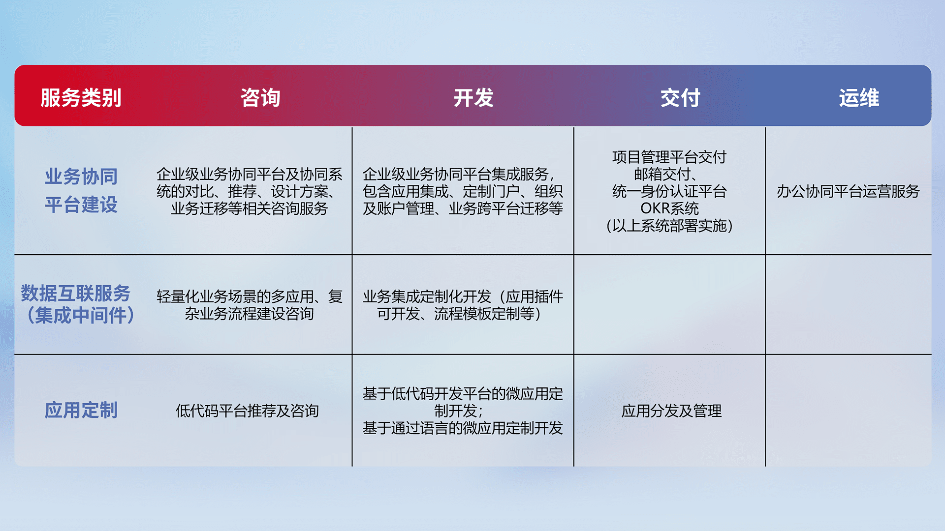 针对钉钉、、企微、、、、IDaas等平台级产品提供产品的规划、、、、方案、、、、交付、、、、定制化开发等服务,,实现如统一协同办公、、、、智能客户服务、、、混合会议管理、、、智能数据查询、、、、等业务场景,,实现数字化转型。。。。